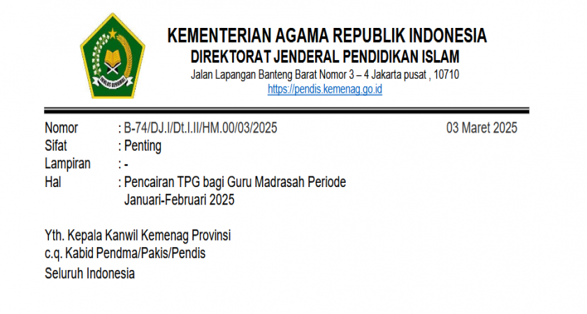 Sehubungan dengan proses pencairan Tunjangan Profesi Guru (TPG) periode Januari- Februari 2025, kami menginstruksikan kepada seluruh Kepala Bidang Pendidikan Madrasah/Pakis/Pendis serta pihak terkait untuk segera melakukan penyesuaian data guru pada aplikasi EMIS GTK melalui laman https://emisgtk.kemenag.go.id mulai tanggal 4 Maret 2025 dengan menggunakan akun SIMPATIKA.